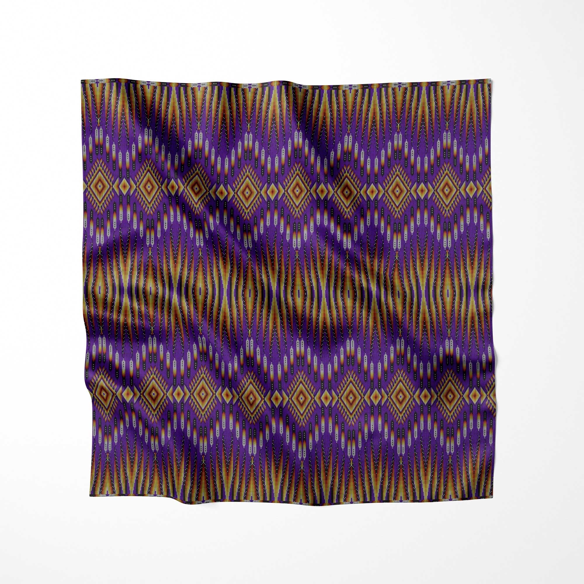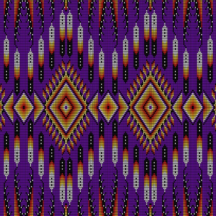 This cotton fabric features beadwork-inspired diamond medallions with cascading feather motifs, creating flame-like movement that evokes ceremony, strength, and cultural storytelling in a design that feels dynamic and powerful. Lightweight yet versatile, it is perfect for ribbon skirts, regalia accents, powwow accessories, and star quilts, while also lending itself beautifully to tote bags, table runners, and wall hangings that honor tradition. Sold by the half yard; multiple quantities are sold in one continuous cut. Pre-wash and dry before sewing to prevent shrinkage. Machine wash cold with like colours; tumble dry low; warm iron.