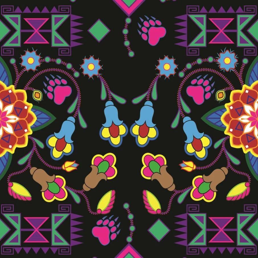 This cotton fabric features a lively dance of beadwork-inspired florals, flowing vines, geometric borders, and bear-paw symbols, creating a rhythmic pattern that celebrates movement, protection, and cultural storytelling. Lightweight yet versatile, it is perfect for ribbon skirts, regalia accents, powwow accessories, star quilts, and shawls, while also lending itself beautifully to tote bags, table runners, and wall hangings. Sold by the half yard; multiple quantities are sold in one continuous cut. Pre-wash and dry before sewing to prevent shrinkage. Machine wash cold with like colours; tumble dry low; warm iron.