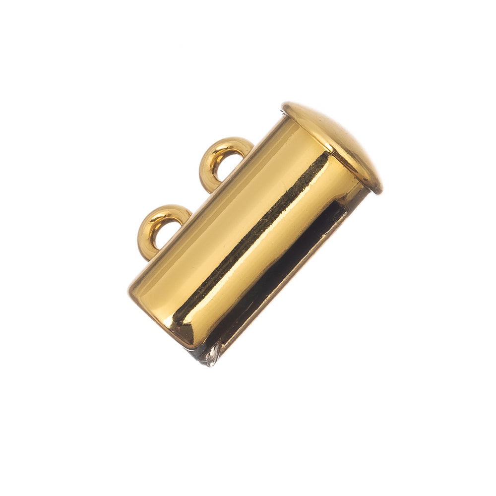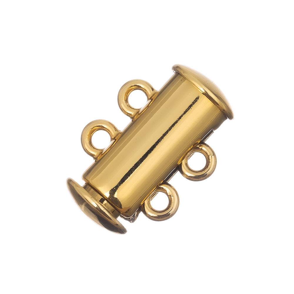 Description: This magnetic slide clasp features 2 small holes on either side, prefect for your multi strand designs. The magnets at the end of the clasp hold it closed and make it easy to open and close. Plated brass. Measures 16mm long x 10mm wide x 6mm thick, 2mm holes.
