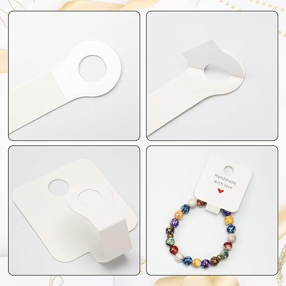 Description: White cardstock paper jewelry cards for bracelets, rings, hair bands. Hand Made with Love message. Self adhesive. Measure 40mm wide x 100mm long x 0.5mm thick.