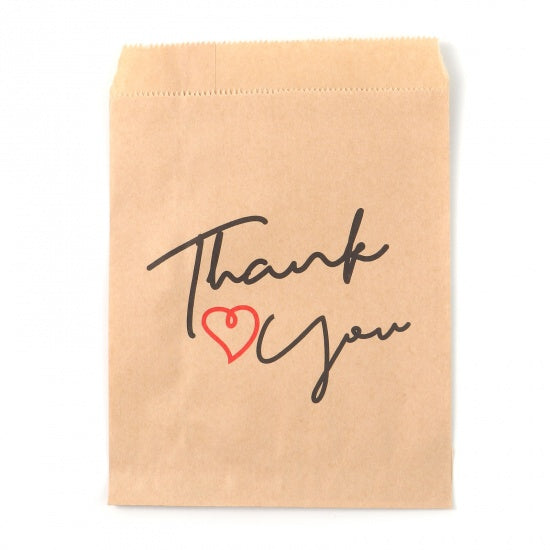 Description: Kraft paper bags, 5x7 inch flat with heart pattern and thank you message. Adds a special touch to customer purchases and gifts. Measures 13cm wide x 18cm long, 0.15mm thick