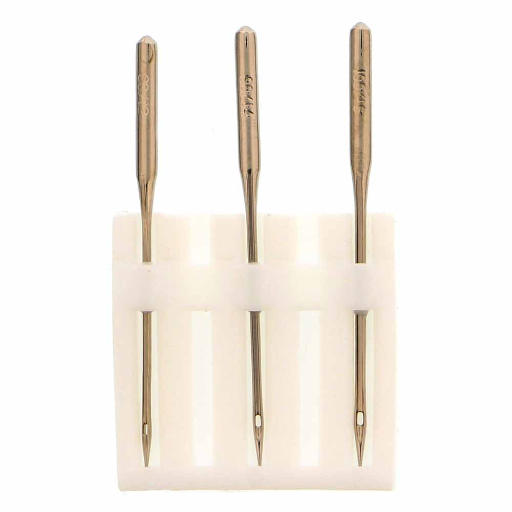 UNIQUE Leather Sewing Needles Assortment includes sizes 80/12, 90/14, and 100/16, with 3 needles per pack. Designed specifically for genuine leather, suedes, and non-woven fabrics, these needles feature a cutting point—also known as a chisel point—that slices through material like a chisel in motion. Ideal for tough, natural materials. Not recommended for ultra suede, synthetic suede, or PU imitation leather.