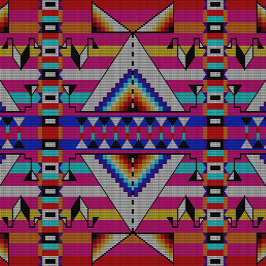 This cotton fabric features beadwork-inspired geometric medallions, stepped diamonds, and path motifs arranged in a balanced, symmetrical layout, evoking themes of medicine, blessing, and cultural storytelling in a design that feels powerful and ceremonial. Lightweight yet versatile, it is perfect for ribbon skirts, regalia accents, powwow accessories, and star quilts, while also lending itself beautifully to tote bags, table runners, and wall hangings that honor tradition. Sold by the half yard; multiple quantities are sold in one continuous cut. Pre-wash and dry before sewing to prevent shrinkage. Machine wash cold with like colours; tumble dry low; warm iron.