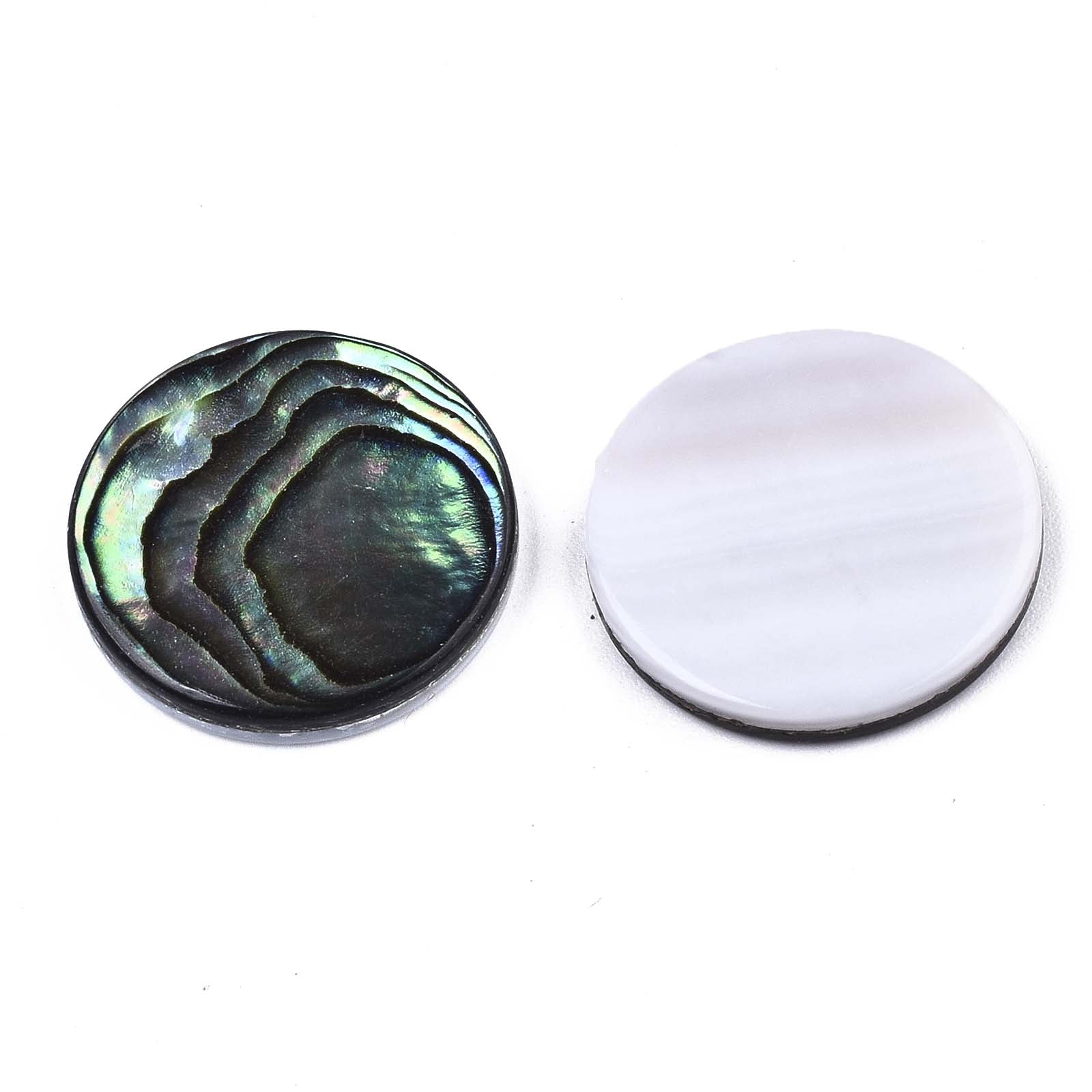 Description: Natural abalone shell round cabochons with freshwatershell backing. Used for making beaded earrings, pendants, and more. This item measures 20mm wide x 3mm thick.