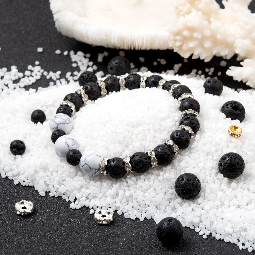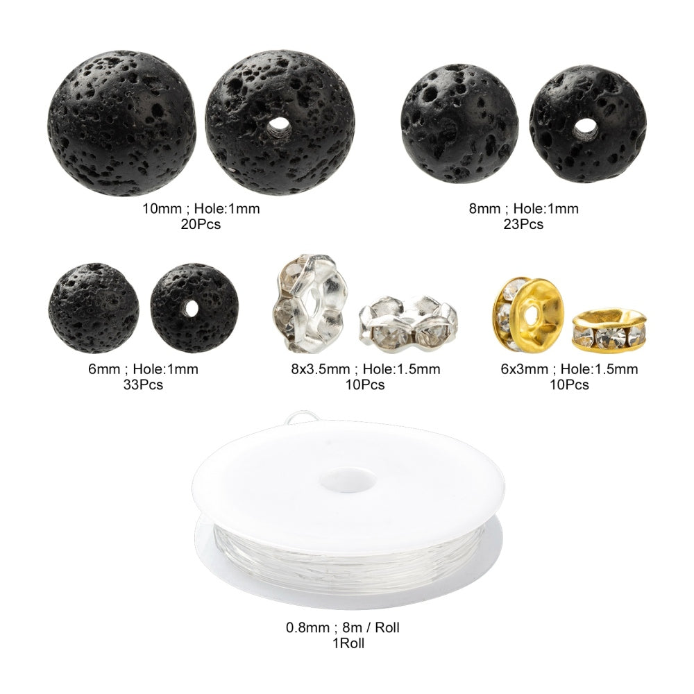 Description: Natural Lava Rock Beads Bracelet Making Kit includes round lava beads, rhinestone metal spacer beads and clear elastic cord.