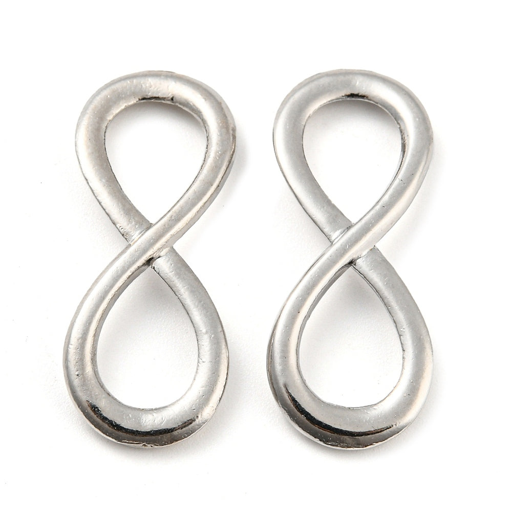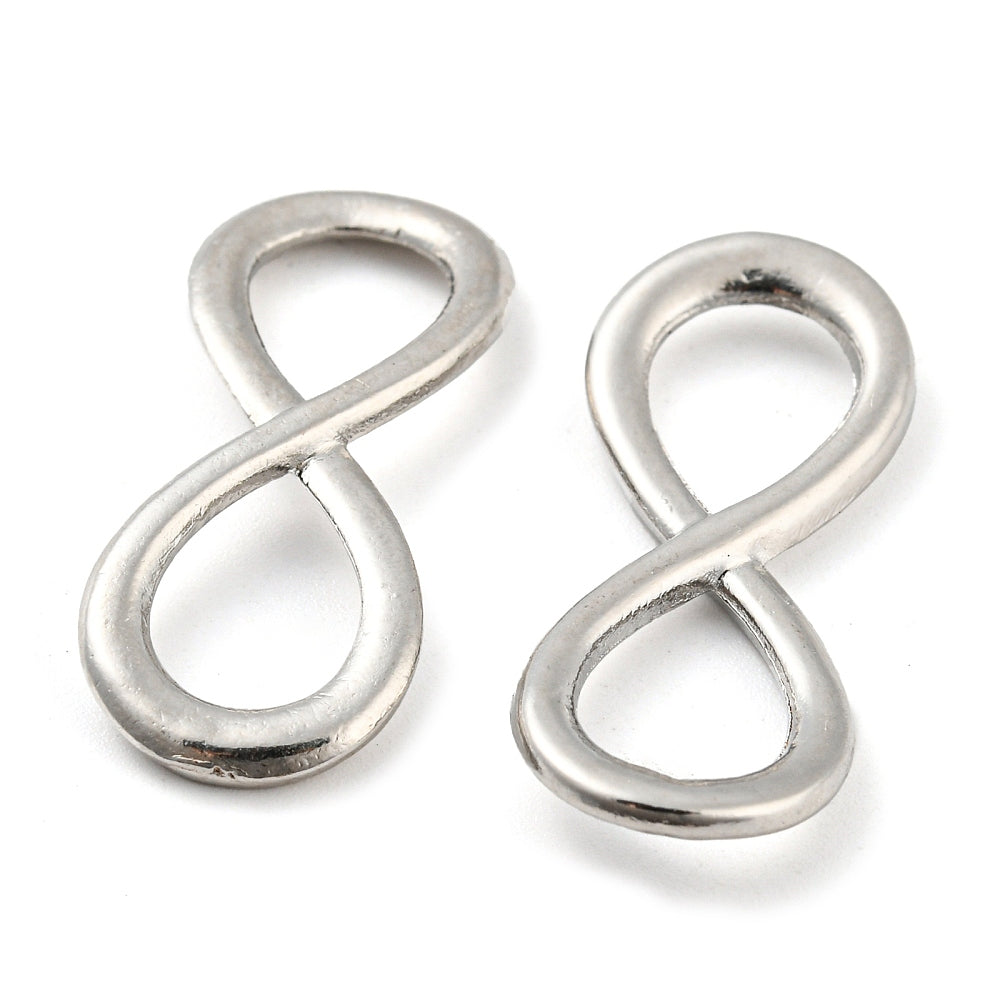Description: Decorative figure 8 infinity symbol, ideal for making inspirational jewelry. Zinc alloy. Measures 12mm wide, 31mm long, 2mm thick. Lead free, Cadmium free.