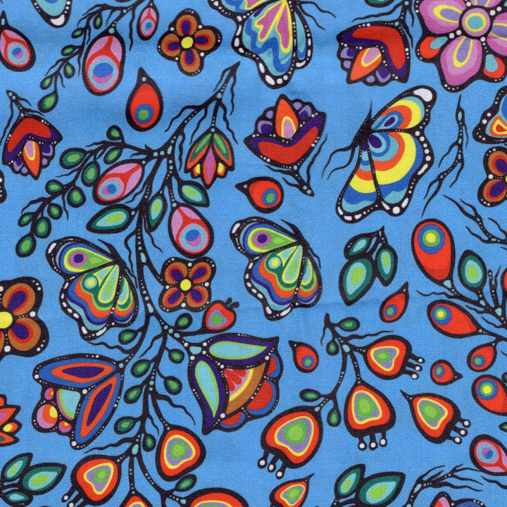 This cotton fabric features Memengwa (butterflies) dancing among Ojibway florals, symbolizing transformation, renewal, and cultural storytelling in a pattern that feels graceful and uplifting. Lightweight yet versatile, it is perfect for ribbon skirts, regalia accents, powwow accessories, and star quilts, while also lending itself beautifully to tote bags, table runners, and wall hangings. Sold by the half yard; multiple quantities are sold in one continuous cut. Pre-wash and dry before sewing to prevent shrinkage. Machine wash cold with like colours; tumble dry low; warm iron.