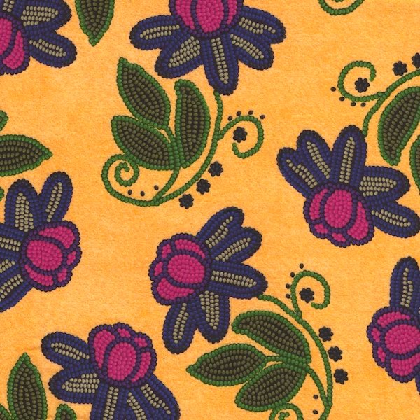 This cotton fabric features beadwork-inspired florals with curling vines and dotted details, celebrating growth, community, and cultural storytelling in a pattern that feels lively and timeless. Lightweight yet versatile, it is perfect for ribbon skirts, regalia accents, powwow accessories, and star quilts, while also lending itself beautifully to tote bags, table runners, and wall hangings. Sold by the half yard; multiple quantities are sold in one continuous cut. Pre-wash and dry before sewing to prevent shrinkage. Machine wash cold with like colours; tumble dry low; warm iron.