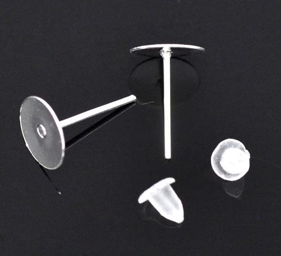 Description: Silver plated alloy earring studs with 8mm flat pad. Measures 12mm long with 0.7mm pin. Includes 100 rubber backings.