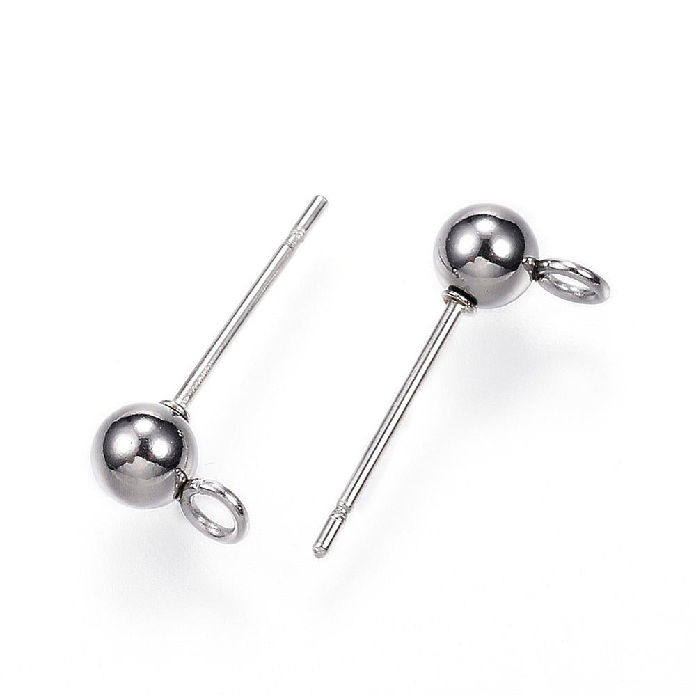 Description: Earring studs with 4mm dome and loop for hanging beads or charm. Backings sold separately. 304 Stainless steel. Measures 15mm x 7mm x 4mm, hole 1.7mm, Pin 0.8mm.