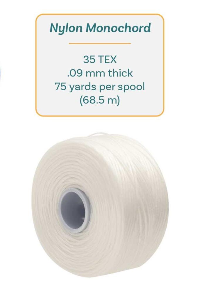 S-Lon 0.09mm beading thread is a fine bonded nylon thread suitable for intricate beadwork that requires flexibility and strength. Its slim profile allows for multiple passes through small beads without compromising durability.